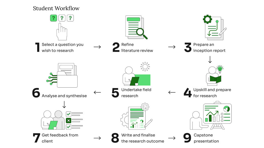 Field Research – The scholar conducts the field research, adhering to the methodology agreed upon and documented in the inception report. The scholar then analyses the data to answer the question posed by the client.